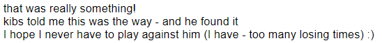 Min gjennomgang av den kampen viser at nordmannens innsats var meget god (som vanlig...), og på sett og vis holdt han lenge laget inne i kampen.