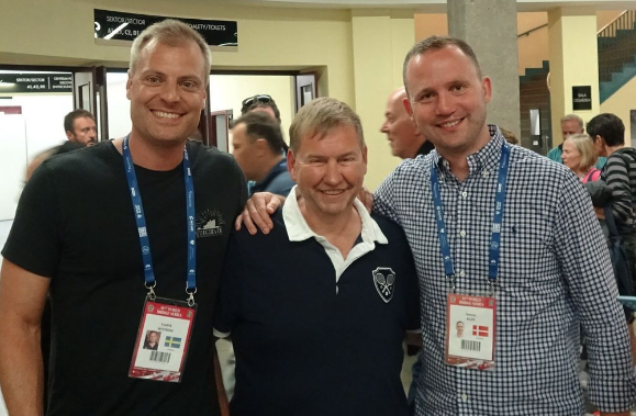 Geir Helgemo flankert av to av sine lagkamerater, makkeren svenske Fredrik Nystrøm (t.v.) og Dennis Bilde fra Danmark