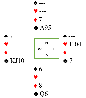 Syd spiller ruter 8, og vest er ferdig samme hva han gjør. Om han trumfer må han spille kløver unna kongen. Om han utsetter pinen og kaster en kløver blir han i neste stikk innspilt på trumfnieren og må avslutte til kombinert saks unna K-J i kløver, ti stikk. Det ga +620 til SOUTH SWEDEN, og spillet ga dermed hele 14 IMP.