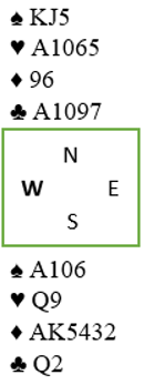 Vest hadde fått utlevert en flott vifte i dette spillet. Etter sterk, kunstig 2 kløveråpning melder vest hjerteren, antagelig to ganger, og havner i 4 hjerter til slutt. Nord spiller ut kløver dame.
