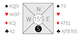 Berset-Ekren var ikke heldige her, de satt N/S mot 6NT. Nord fant spar ut som var det beste de kunne gjøre, men å holde kontrakten på kun tolv stikk og -990 ga likevel -10 til N/S.