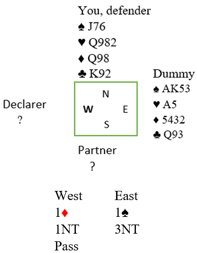 Jeg har alt for mange dårlgie opplevelser av å la motparten spille hjem 6 eller 7 stikk på 1-trinnet, så istedet valgte jeg krumspringet til 3NT. Jeg er usikker på om dette er vinnende bridge, men uansett, her var jeg og skulle spille hjem 9 stikk. Vest spiller ut liten spar, og bordet AQ i fargen viser at det ihvertfall ikke var der øst hadde sin poengstyrke.