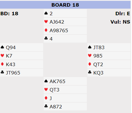 Det var en god del spillere som syntes de tenkte ok idet de meldte her, og landet i 2 ruter. Men det før de fikk se bordet i den kontrakten. Så den nesten patetiske scoren - slik hele spillet ser ut - +150 til N/S ga faktisk litt over 20%.