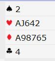 Dette er en hånd som kan være meget sterk, mye sterkere enn de 9 poengene du teller. Men da må det finnes tilpasning i en av rødfargene. Hvis makker har kløver og spar som det ofte er er ikke nords kort verd mer enn de honnørpoengene du kan telle.