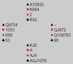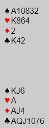 Svaret avhenger vel av om du er god til å tippe, for tippes hvor ruter dame befinner seg blir det fort tretten stikk her. Dessuten kan jo den damen være singelton slik at det blir "claim" nokså tidlig. Men om to kløver kastes på A-K i hjerter må ruteren sitte 3-2 i tillegg hvis du spiller på damen hos nord. Om det spilles på ruter dame som hos syd kan godt ruteren sitte 4-1.