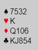 Syd åpner med 1 kløver, vest melder inn 1 hjerter og nord sier 2 kløver som viser vanlig høyning (6-9), men normalt med minst femkorts kløver siden åpningen ikke lover fire-korts farge. Du passer, det samme gjør syd før makker kommer tilbake med 2 ruter. Både nord og du passer, men syd gir seg ikke og sier 3 kløver - pass - pass til deg. Dobler du?