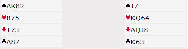 SWp 8 tok 1. stikk, hj K ble innkassert, trumf til konge og hj 6 til stjeling. På sp10 til knekten fulgte alle, jeg tok hj A der begge imot fulgte og kunne deretter trekke ut siste trumf, ta for hj D og hj 8 somk nå sto og hadde problemet i ruter igjen. Hvordan ville du spilt? Litenmntil esset og ny opp, eller ru 9 som får seile eller ru D i håp om ru K i Øst?