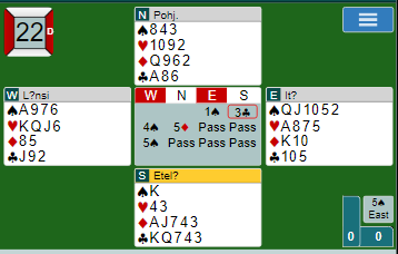 Med dette er det nok feil å melde 5 spar som den finske vest gjorde. Det er alt for stor sjanse for at 5 spar vil gå bet. Muligens oppfattet han østs pass over 5 ruter som kravpass (invitt til å melde videre). Det bør det ikke være i slike meldingsforløp, men hvor grensen er for kravpass er må selvsagt avtales i det enkelte makkerpar.