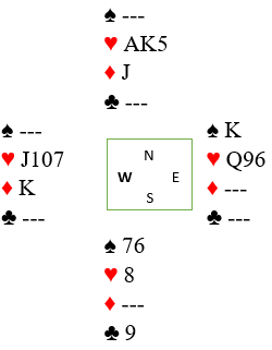 Kløver 9 spilles. Vest må holde ruter konge, og dermed må hun ned på dobbel hjerter. Da forsvinner ruter knekt fra nord, og det er øst sin tur å føle presset. Hun må holde spar for at syd ikke skal få sparstikk, og dermed må også øst ned på kun dobbel hjerter.
