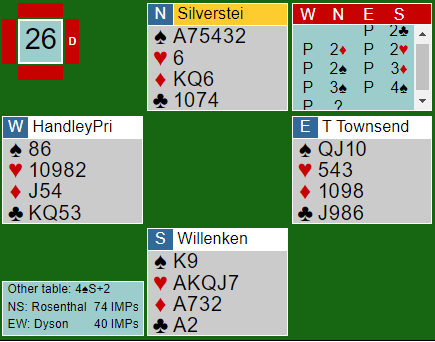 Brogeland-Bakke sine lagkamerater Silverstein-Willenken startet med 2 kløver - 2 ruter. Fordelen med frekvent å svare 2 ruter er at den sterke hånden lettere får meldt sin hånd. Syd sa 2 hjerter over nords svar 2 ruter, og nord meldte 2 spar. Da kom 3 ruter fra syd før nord sa 3 spar. Syd løftet til 4 spar. Hva nå?
