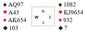 Vel, det står jo 6 hjerter om sparfargen gir fire stikk så en minortaper kan kastes. Det nytter ikke å satse på ruter, for så snart N/S kommer inn tar det selvsagt ett stikk i kløver. Så spar må sitte veldig snilt, syd må ha både knekten og kongen.