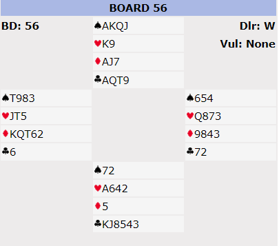 I dette spillet ble det uhyre enkelt for nord. Over svaret 3 kløver støttet han til 4 kløver, og trumfen var fastsatt. Syd meldte 4 ruter som kontrollmelding (første- eller andre rundes kontroll), og nord gikk på med 4 spar som med kløver, ruter eller hjerter som trumf kan brukes som Key-Card Blackwood. Det er for å holde svarene så lavt som mulig i de tilfellene det også må spørres om trumfdamen. I dette tilfellet ville det blitt akkuarat det samme om nords spørsmål om antall nøkkelkort hadde vært 4NT. Syd viser uansett to nøkkelkort (hjerter ess og trumfkongen, kløver konge). Da visste faktisk nord absolutt ALT og kunne melde sluttkontrakten og egentlig forlange de nødvendige stikkene allerede før blindemann ble lagt ned!