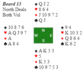 Det kan se ut som et såkalt Dummy Reverse spill det her. Dvs. at den korteste trumfhånden blir gjort til hovedhånd. Hvis tre ruter kan trumfes hos vest står blindemanns kort bortsett fra de to spartaperne og en taper i kløver. Men det er ikke overganger nok til å få trumfet tre ruter uten at N/S må slippes inn, og hvis det da kommer trumf hver gang får de spilt tre runder trumf og det blir ikke mer enn to trumf igjen hos vest til å få det til via Dummy Reverse. Men å komme på den tanken (å stjele ruter) gjør at du også bør komme på hva som er ekstrasjansen i tillegg til at trumfen sitter 2-2 (da blir det alltid to trumf igjen hos øst til å stjele to spar), eller at forsvaret tråkker feil og ikke fortsetter med trumf hver gang de er inne. Ruteren kan gi ekstra stikk! Og det satt slik at de som spilte riktig vant utgangen selv etter det ubehagelige trumfutspillet: