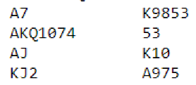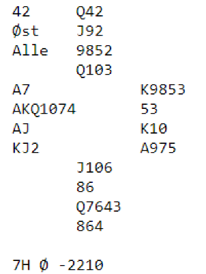 Det kan diskuteres, men storeslem i hjerter har bra sjanser. Det må selvsagt unngås hjertertaper. Hjerteren 3-2 er en 68% sjanse, men i tillegg til det kan hjerter knekt sitte singel. Det er imidlertid ikke helt nok at hjerteren går. Men gjør den det er det meget gode sjanser. Enten kan spar spilles god med en eller to stjelinger (3-3 eller 4-2 sits). Og om spar sitter 5-1 er det fortsatt en mulighet, kløverfinessen kan gå. Og det er dessuten en liten tilleggssjanse ved at om syd har fem spar blir det en showup skvis mot han om han har kløver dame tredje (eller flere) sammen med sparlengden, slik at mot slutten hvor syd er skviset ut av kløveren sin (om han har damen eller ikke) for å holde spar, kan kløver dame toppes ut om nord har dobbelton kløver (syd har i så fall ikke flere kløver idet kløver spilles mot K-J til slutt, og syd kan følgelig ikke ha damen). Vel, de mer opplagte sjansene (godspilling av spar, eller kløverfinesse) er veldig gode sjanser, men det er kanskje likevel totalt sett marginalt for liten prosentsjanse til at storeslem bør meldes (?). Ved bordet idet man sitter og melder vet man dog normalt ikke den eksakte prosentsjansen for å vinne alle stikkene.