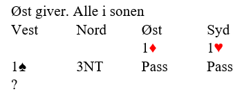 Du sitter i vest og har utspillet mot 3 NT. Motparten har meldt i fred. Spilleren til venstre for deg har meldt hjerter, mens motspilleren til høyre har vist spar. Kløver er et opplagt utspill, og du spiller ut?