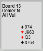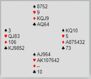 Det er på ingen måte nok stikk til å vinne denne utgangen om ikke kløverfargen blir godspilt. Det er dog et åpenbart problem, idet kløveren godspilles mot Ø/V få komme inn, og om det er øst som kommer inn er det lett å se at det går fryktelig galt om ruteren sitter slik som det ser ut, A-Q sjette (fra start) hos vest og to små hos øst. Øst spiller ruter gjennom syds konge, vest får fem ruterstikk og det blir to bet.