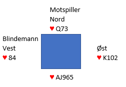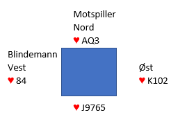 Makker (syd) spiller ut en liten hjerter mot østs grandkontrakt. Det heter jo høyt for makker, så å stikke med esset og spille damen tilbake går greit som oftest. Men det kan sitte slik: