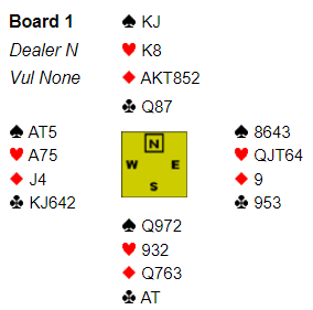 Jeg (øst) spilte ut hjerter dame mot nords 3NT. Nord hadde åpnet med 1NT så den lange ruterfargen var skjult.