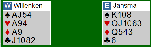 Det er ikke så mange HP til sammen, men utgangen 4 hjerter er ikke dårlig. Og det presset Willenken-Jansma seg opp i med vest som spillefører etter grandåpning og overføring til hjerter fra øst.