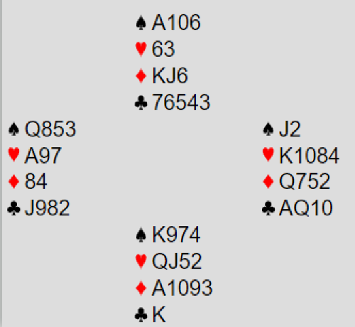 Hvis syd har noe sånt som K-J i hjerter og ønsker hjerter gjennom skifter han ikke til stor spar som setter opp stikk til motparten først, men han forsøker å få inn makker for å få hjerter gjennom mens han fortsatt har spar konge som han kan komme inn på senere. Altså skal det spilles ruter fra nord nå, det må være forsvarets eneste håp.