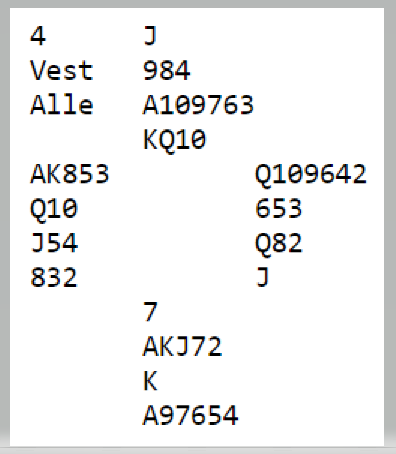 Hvis spillefører etter en hjerterhonnør spiller seg over til nord på kløver konge og tar hjerterfinessen faller hodet i taket på han. Vest vinner med trumfdamen og spiller kløver slik at øst kan stjele - en bet! Det gir nære bunn på spillet, og ganske fortjent vil jeg si.
