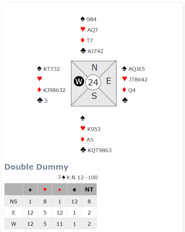 Tre par fikk spille 6 kløver selv om altså Ø/V selv har slem i kortene. To av de kløverslemmene var doblet og de delte toppen N/S for +1090. Fire Ø/V par var i slem, tre av dem doblet (en i 6 ruter), og to Ø/V-par delte toppen den retningen for +1210. Det svingte altså 2300 poeng fra topp N/S til topp Ø/V.