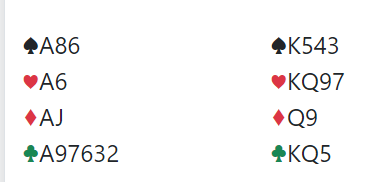 Mange utpregede fordelings- spill kom opp tirsdag 16/5 og her var Tone Annette Olsen(Ø) og skribenten i fight mot Kjell Aadahl (N)- Terje Haug (S). Jeg hadde dette som syd i spill 13 der Kjell var giver var giver med alle i faresonen. Som Vest hadde jeg: