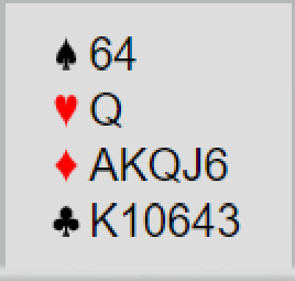 Ved det andre bordet var Rubbestadnesets N/S også i 6 hjerter og fikk ruter ut. Der ble det spilt hjerter til esset og hjerter til kongen for så å ta kløverstikk med avkast av ruter og spar fra syd. Men da ble det en bet siden hele spillet så slik ut: