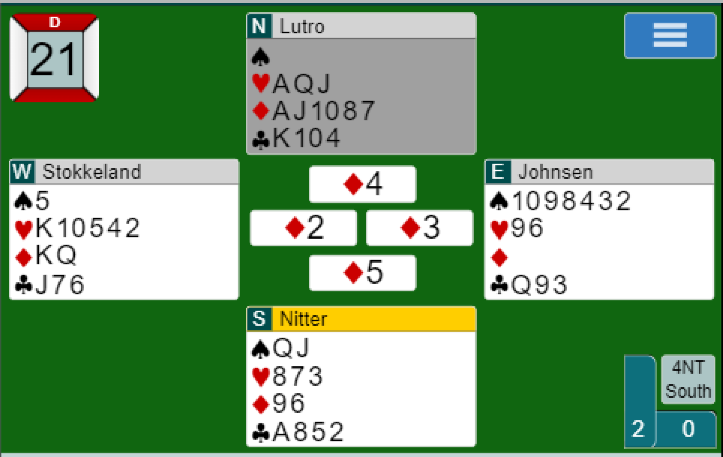Ruterfargen er egentlig uinteressant, den gir fem stikk ved hjelp av normal spilling siden K-Q sitter foran. Det fikk Nitter også, men det det startet altså med ruter 5, ruter 2, ruter 4, ruter 3....femmeren vant stikk i første ruterrunde. Gøy, men da samme Nitter spilte på skvis senere og fikk elleve stikk ble det 1 IMP tapt siden Johansen ved det andre bordet tok de tolv stikkene som var der ved hjelp av å godspille ruterfargen og ta en enkel hjerterfinesse. Spillet fikk ingen betydning for verken utfallet av kampen eller sluttresultatet i turneringen.
