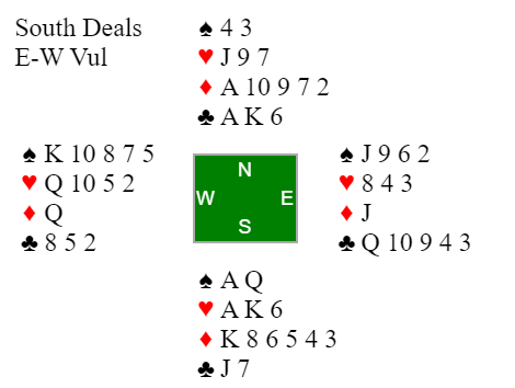 Du har altså havnet i 6 ruter som syd. La oss si vest spiller ut trumfdamen og øst følger med ruter knekt. Ved første øyekast ser det ut som om slemmen avhenger av sparfinessen. Om den ryker har du en liten sjanse til, at hjerter dame faller. Hvordan spiller du?