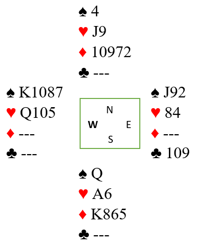 Opp med spar ess. Det tas en trumfrunde, så elimineres kløver med A-K og kløver til stjeling. Du tar for en hjerterhonnør for å ta med den bitte lille sjansen at øst har singel hjerter dame før posisjonen har blitt slik: