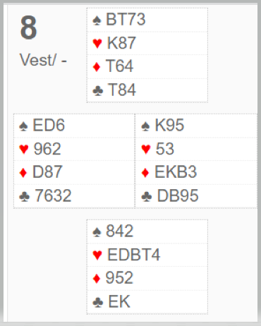 Scorene varierte veldig, men bare mellom +80 til N/S og +110 til Ø/V som kan vinnes i delkontrakt i kløver ved å gjette riktig i kløverfargen. Det må spilles til finesse med kløver til nieren første aller andre gang, ikke satse på en honnør foran og spille liten til knekten, så liten til damen andre gangen, da blir det tre kløvertapere). Å spille for eksempel 2 hjerter som N/S med en bet ville gitt middels. To par delte toppen Ø/V med +110 for ni stikk i kløverkontrakt, og det ga hele 96,9% til Ø/V.