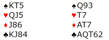 Slik kortene sitter fordelt har N/S minst fem tapere i hjerterkontrakt, det kan fort bli to bet i 3 hjerter. Aa-Livgård greide seg med å gå en bet, Norge -50.