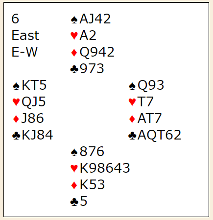 Joda, det ville blitt bet om vest hadde truffet ruterutspillet siden øst satt med ruter konge. Selv ville jeg kanskje prøvd kløver dame i utspill, men mot det norske paret valgte vest å spille ut trumf. Dermed føk 6 spar hjem, og det ga delt topp med ett annet par (96,9%) på veien mot norsk bronsemedalje i mesterskapet.
