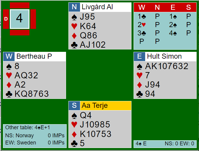 Ved det andre bordet spilte Tor Eivind Grude 4 spar og fikk også kløver 5 i utspill til kongen, esset og nieren. Hvis syd har 5-4 dobbel i kløver kan vel kanskje kløver tilbake være feil, og den svenske nord skiftet til trumf. Da ble det lett for nordmannen. Grude tok A-K i trumf og spilte kløver til damen, kløver til stjeling, hjerter til esset, kløver til stjeling og trumf til nord. Nå var to kløverstikk godspilt og det var fortsatt inntak til vest på ruter ess. N/S fikk kun for kløver ess og det ene trumfstikket, Norge +650. Spillet ga 13 IMP til Norge.