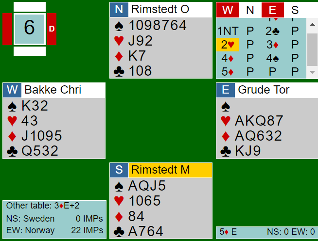 Her var det en kontrollert meldesekvens av Grude-Bakke via an kunstig 2 kløvermelding av øst i andre runde. De sniffet litt på slem da øst meldte 4 spar på renonsen, men det gjorde ikke vest sine kort noe bedre. Og det mangler to nøkkelkort her, så slem bør ikke meldes. Det står i tolv stikk slik det sitter, men det er noe mindre enn 50% sjanse for det da noen skjeve sitser kan gjøre det vanskelig (eller det kan være direkte bet med 5-1 i kløver). Så 5 ruter er korrekt kontrakt. Det ble tolv stikk pga. den snille sitsen, Norge +620.