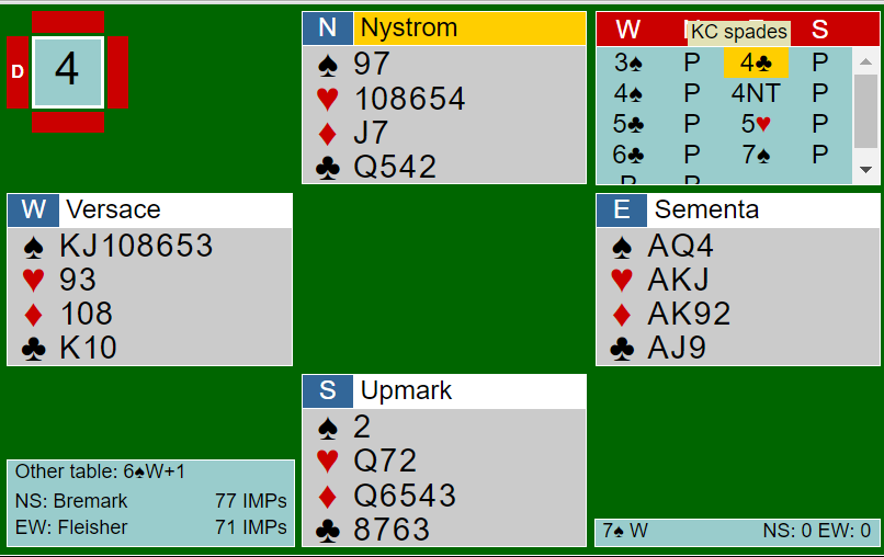 Ved det andre bordet fikk syd det litt enklere da vest spilte ut hjerter så spillefører måtte prøve finessen i første stikk. Den holdt, så ruter til liten og syds dame som vant stikket. Nå tok Upmark nok en hjerterfinesse og kunne gå på trumfen etterpå. Han tapte kun to trumfstikk og ett stikk i ruter da en kløver fra syd forsvant på det tredje hjerterstikket. Ti stikk og pluss 420 var verd 10 IMP på veien mot finale mot lag FLEICHER.