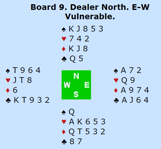 ZIMMERMANN sitt Ø/V-par stoppet i 3 spar før N/S (Levinson-Shenkin) var med til 4 kløver. Ø/V fant motspillet; ruter 10 i utspill. Ruter til stjeling idet vest var inne på trumfesset, så over til vest i spar, og nok en ruter ga stikk for den nå single trumfknekten siden nord kun hadde mindre trumfer. Godt motspill, men Ø/V har jo minst 3 spar i kortene.