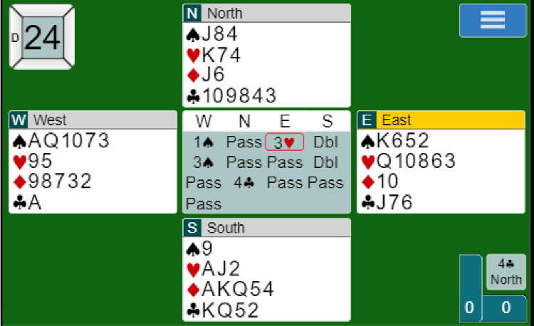 Sp- hj 9876432- ru A65- kl K1 ble fristet.. Skrale saker, 7 hp men laaang svak hjerterfarge. Men da Nord åpnet med 1 spar i gunstig sone, Tone Annette i Øst passet og Syd svarte 2 spar, 3+ og 6-9 hp slo jeg til med et rent gambler- bud av 4 hjerter. Nord og Øst passet men Syd valgte å strekke seg til 4 spar. Det budet kunne Øst doble der hun satt med sp DJJ742- hj 5- ru KJ43- klJ42.