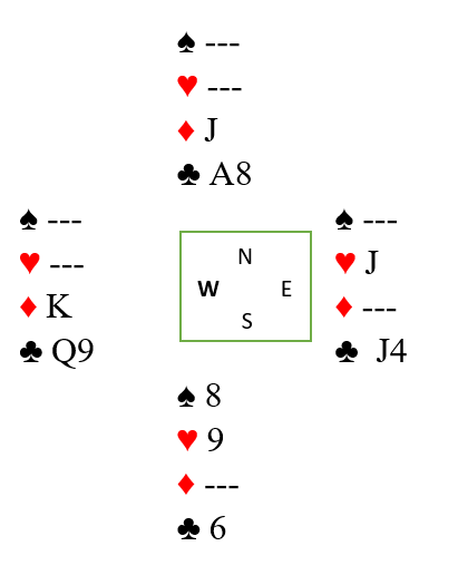 Det har altså startet med trumf ut, ruter til vest i stikk to, trumf til damen og ruter dame som øst setter i en trumf på. Syd trumfer over og dukker en hjerter. Nå er det ikke for å få trumfet hjerter, for det er jo ikke trumf igjen hos nord. Å gi bort hjerterstikk nå er for å få tempoet i orden for en skvis («rectify the count»). La oss si øst vinner det hjerterstikket (det skjedde ved noen bord). Nå virker det naturlig for øst å spille mer hjerter, det er jo som nevnt ikke trumf igjen hos nord.