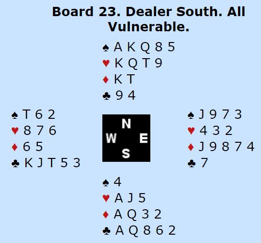 Det var en lang rekke med +1460 for 6 spar med tretten stikk etter hjerterutspill. Å spille den teoretisk korrekte kontrakten 6 spar rmed tolv stikk, og å unngå at de stampet i 7 hjerter ga faktisk litt under middels.