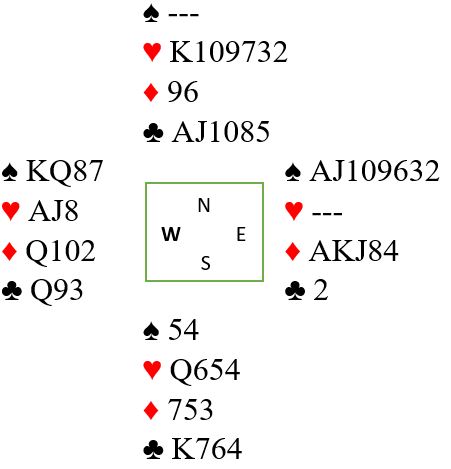 N/S har en fin stamp i 7 hjerter. Men hva om Ø/V melder 7 spar? Om det er øst som er spillefører må syd i så fall treffe kløver ut, hvis ikke fyker storeslemmen hjem! Er kontrakten 7 spar på øst sin hånd bør nok nord doble for å få annet utspill enn det mest vanlig når man har meldt og støttet, her hjerter. Men det kan jo hende ruter ut til stjeling er tingen.