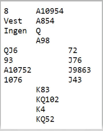 Vest valgte imidlertid et merkelig og ikke særlig heldig utspll da han sendte i vei en liten ruter. Ruter dame vant første stikk. For å få i nok stikk må det spilles på sparen, men da blir det automatisk bet med ett sparstikk og ruter ess til Ø/V.
