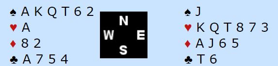 Neida, dette er nok normalt kun en utgang, men det står noen ganger tolv stikk, eller kanskje tretten stikk hvis hjerteren går. Men det er forutsatt at det kommer kløver ut, og ruter ut gjør det mye verre for ikke å si umulig. Og spillet får faktisk slik kortene sitter hos motparten en helt annen og merkelig konklusjon: i teorien står det ikke utgang engang!