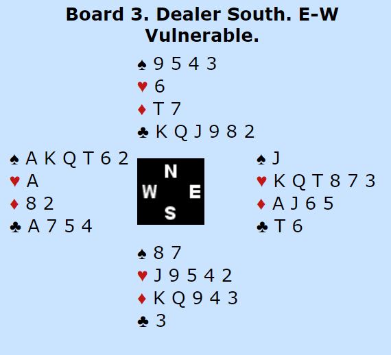 Dette – ruterutspill – skjedde neppe noen steder mot sparkontrakt. Nord spilte naturlig ut kløver konge. Da kunne spillefører ta ut trumfen og senere hente to hjerterstikk hos øst med inntak på ruter ess. Det ga elleve stikk, normalresultatet.