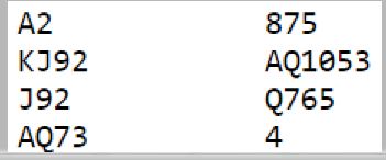 Ruter 9 gir en finessemulighet, så det bør satses på ruter 10 hos syd. Men det bør ikke spilles liten til nieren på direkten. Da kan en risikere at nord med K-10 eller A-10 dobbel vinner stikket med tieren, og da blir det tre rutertapere. Beste ruterbehandling er liten fra vest til damen, da fanger en opp en eventuell honnør-10 dobbel hos nord. Hvis ikke tieren kommer på må du legge damen og senere sette din lit til ruterfinessen med nieren. Slik så hele spillet ut: