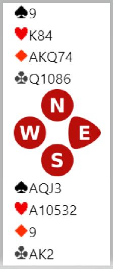 Du skal spille 6 hjerter og det kommer spar ut fra vest, ingen trussel akkurat. Her ser det ut til å være enkelt medmindre trumfen sitter skjevt. Hjerter 8 sammen med tieren gjør at du kan takle noen 4-1 sitser, flest om det er øst som har fire. I dette tilfellet har du ingenting å gå etter, motparten har ikke meldt. Da er det vel naturlig å spille hjerter konge først. Nieren kommer på fra vest. Nå bør det safespilles med liten til tieren. Ryker den til honnør sitter trumfen 3-2 og esset tar senere ut den siste trumfen deres. Denne spilleføringen tar imidlertid med seg at øst har Q-J fjerde også.