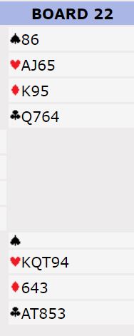 I turneringen hvor det var 26 bord vant seks N/S-par utgang i hjerter. Ruter knekt må egentlig spilles ut i første stikk for å bete den utgangen. Det var noen N/S-par som fikk inn +100 for en bet i Ø/V sin 5 spar, og det var også åtte par som vant utgang Ø/V for 4 spar med ti stikk.