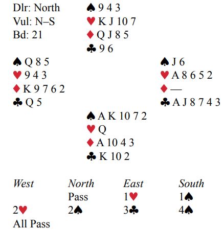 Ved det ene bordet vant øst 4 spar selv om jeg mener han kanskje ikke spilte veldig godt. Kløver dame kom ut til esset fulgt av liten spar fra vest til knekten. Det er neppe beste spilleplan og kan for eksempel bli ganske fælt om syd vinner stikket med singel spar dame. For øst har et par kløvere som må ordnes plassering for, og en slik trumfbehandling kan godt føre til to trumftapere selv om han med andre trumfsitser enn denne i mot kunne fått ingen, eller en spartaper. Etter den starten er det vanskelig å se hvordan 4 spar skal kunne vinnes. Men syd så kun sine egne kort og blindemann (vest) sine, og med det bordet er det vel ikke så unaturlig at det ble skiftet til liten hjerter. Det ble veldig feil når den skjulte hånden øst hadde K-10-9: liten fra vest, knekten fra nord og kongen. Så kunne finesse over syds hjerter dame tas. Spillefører fikk rullet opp hjerteren uten taper og ialt fire stikk i fargen. Øst vant ti stikk med en rutertaper og to trumftapere.
