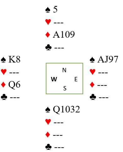 Syd kunne avblokkert hjerter dame slik at nord kommer inn i tredje hjerterrunde, men det hjelper ikke. Nord spiller i diagramsituasjonen ruter. Øst setter i spar 7 og syd kan trumfe over med tieren som vinner stikket. Men med tre kort igjen må syd spille trumf fra damen tredje, og spillefører tar resten.